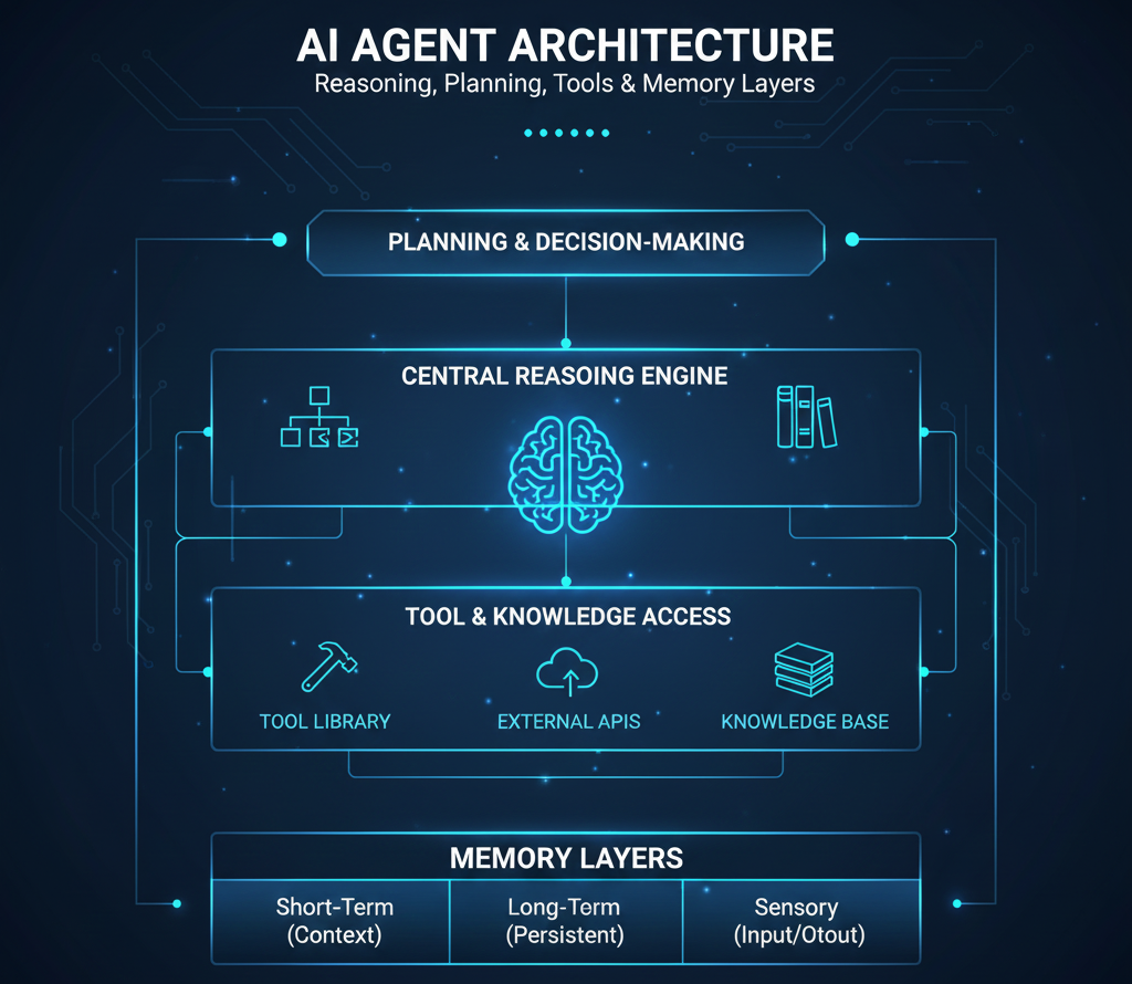 The reasoning engine is the cognitive core of an AI agent. It interprets tasks, analyzes constraints, evaluates multiple solution paths, and selects the most appropriate action. When errors occur, the reasoning engine diagnoses the problem and determines corrective steps. This allows agents to adapt dynamically instead of following static instructions.