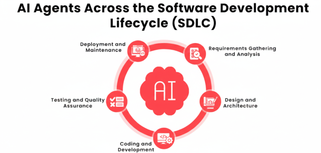 AI agents support developers at every stage of the software development lifecycle, enabling continuous automation and optimization.