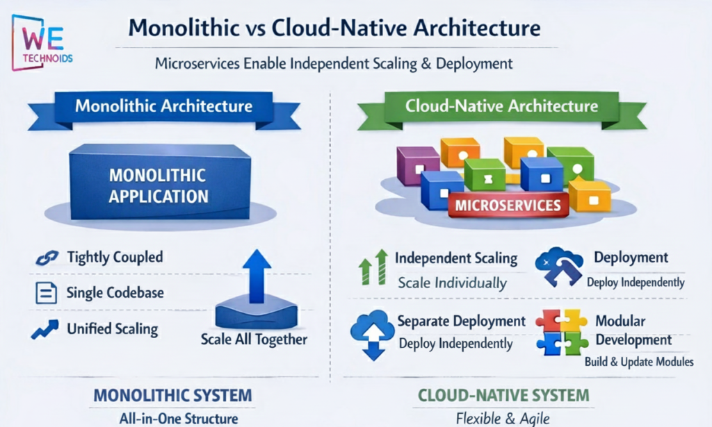 In cloud-native systems, applications are divided into multiple microservices, where each service handles a specific business capability such as authentication, payments, analytics, notifications, or user management. Every microservice is developed, deployed, and scaled independently, which allows development teams to work in parallel and release features faster. If one service needs additional processing power, only that service is scaled instead of scaling the entire application. This reduces infrastructure cost and improves performance efficiency.
