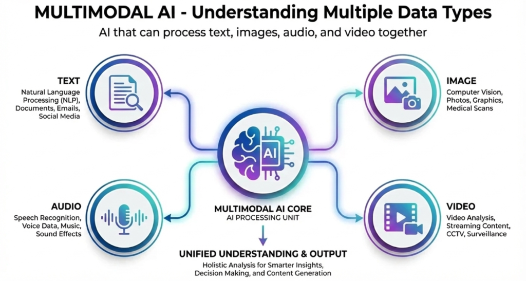 While GPT and Gemini introduced multimodal understanding, future AI models will deeply fuse multiple data types into a unified reasoning system. Post-Gemini models will seamlessly process text, images, video, audio, sensor data, and real-time streams simultaneously. This enables richer understanding and more accurate decision-making.