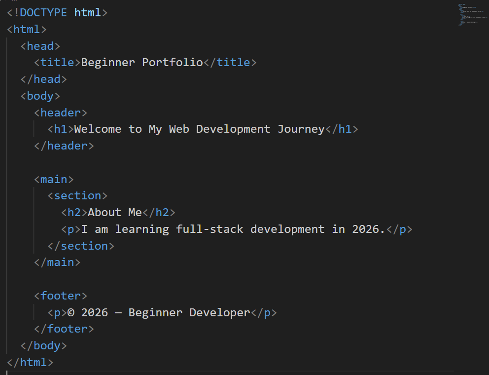HTML (HyperText Markup Language) is the backbone of every webpage. It defines structure, hierarchy, semantics, and meaning. Beginners should not treat HTML as “just tags” — instead, it should be viewed as a content blueprint that improves accessibility, search optimization, and readability. Elements like headers, paragraphs, lists, navigation blocks, forms, and media containers define logical document flow. Semantic elements such as <header>, <main>, <section>, <article>, and <footer> help browsers, screen readers, and search engines understand content purpose.